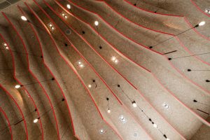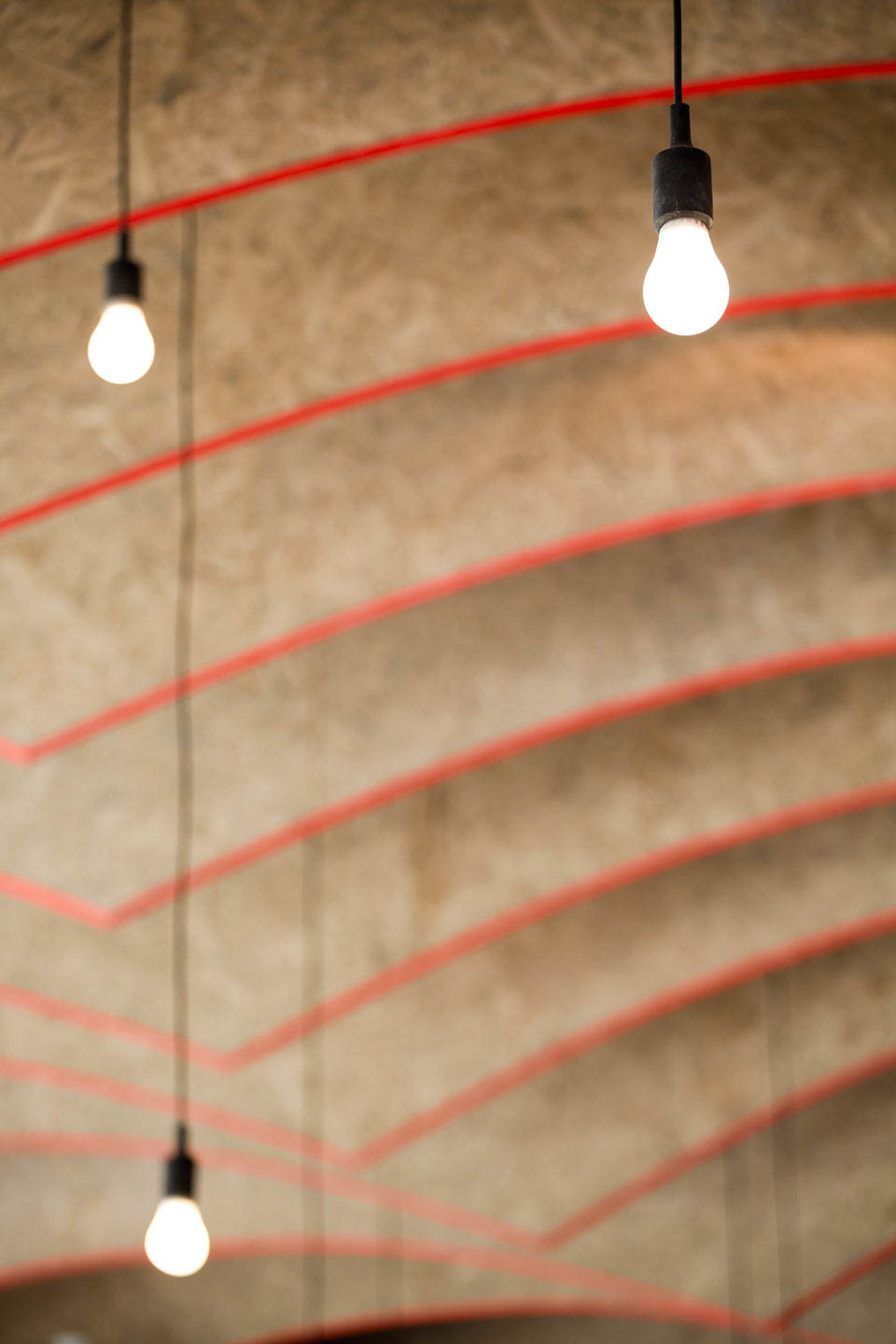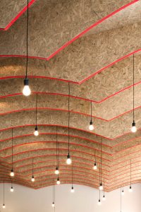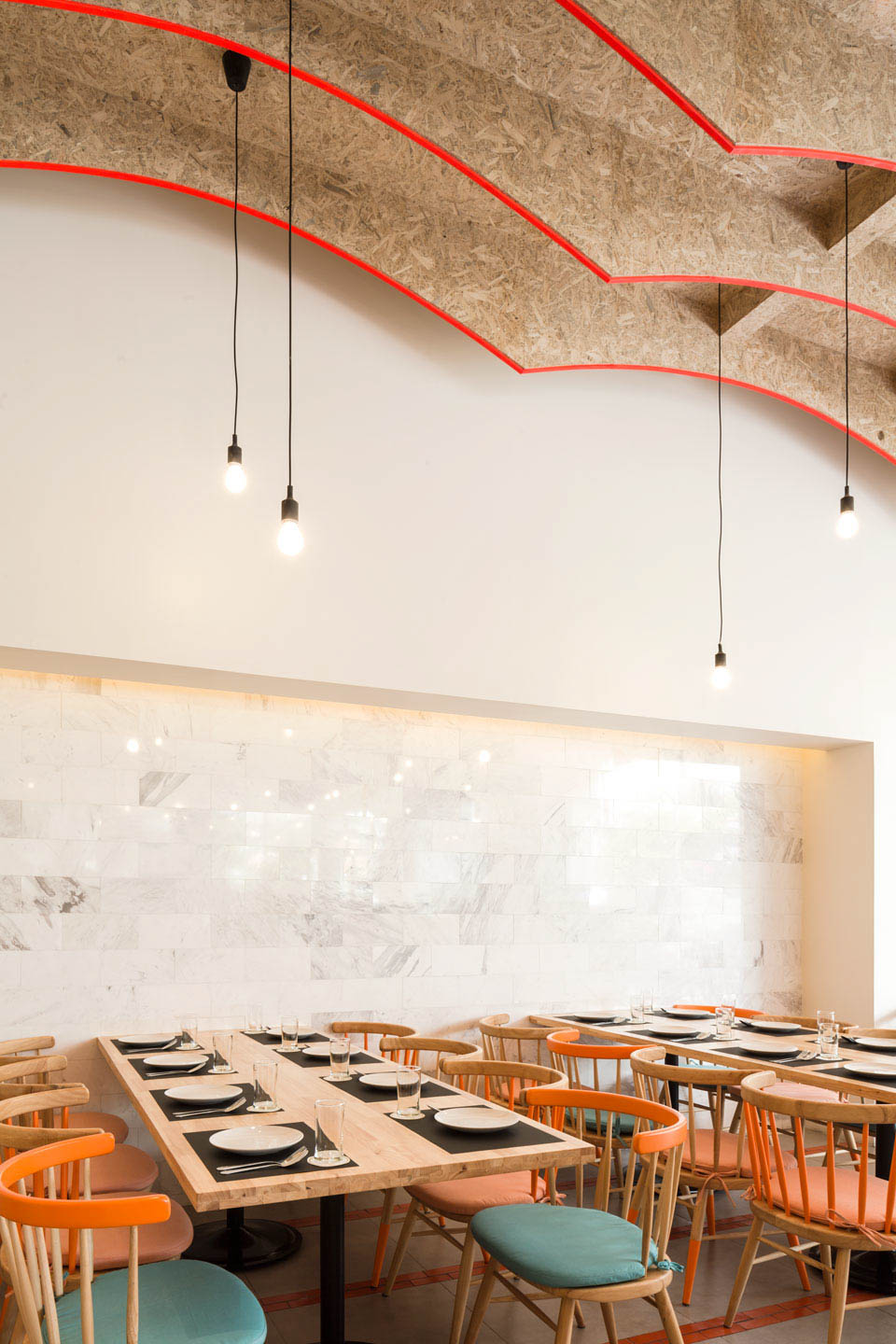 The latest branch of Laem Charoen Seafood Restaurant Bangkok occupies two-hundred and thirty-four square meters on the ground floor, next to the entry, of the Sense Community Mall on Pinklao Road. This family-style eatery welcomes the seafood lovers with an open-plan layout and a cheerful color scheme. The turquoise blue handmade ceramic tiles highlight the grid pattern on the floor whereas the matte silvery grey PU walls are padded in vertical lines. Particular attention is placed upon the ceiling of four and a half meters high. Onion arranges the OBS Boards in a radius pattern based on the parameter of the existing glass facade. Three continuous curves are cut out from each vertical board. They give the visual effect of paralleled circumferences, running from the building envelop to the direction of service station inside the restaurant. The edges of these OBS Boards are painted in florescent orange color matching with the orange local ceramic tiles on the floor and the color of the chairs. Onion’s color scheme is conspicuous because of its background materials, namely the white marble and the black ceramic tiles.